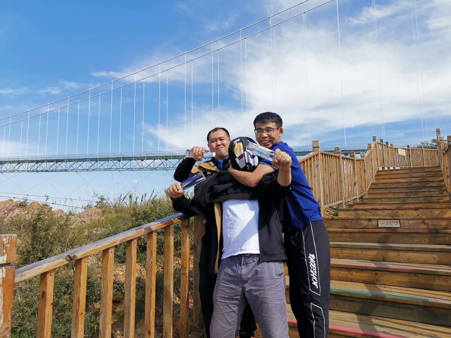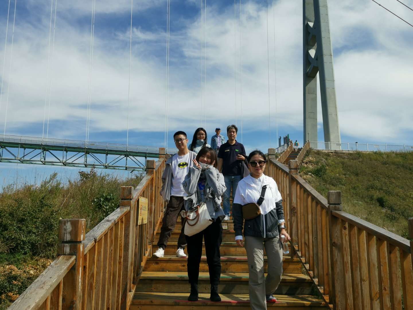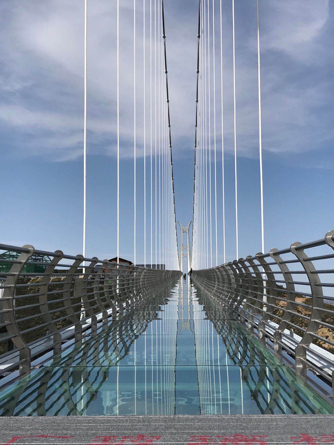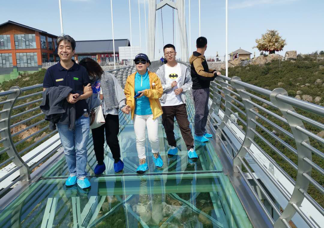 14日下午游覽車載著一行人行駛在山間的小路上,清風徐徐,好不愜意,接著迎來了全長639米的玻璃棧道挑戰,驚心動魄,姿態百出。